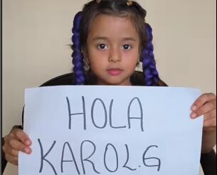 “Hola, Karol G mi nombre es Allison Ximena. Uno de mis sueños es conocerte y como en enero cumpliré mis seis años, le dije a mi mamá que quería que vinieras a mi cumpleaños. Pero como sé que estás muy ocupada, me encantaría que me regales un saludo”, es parte del texto que reseñan los pequeños anuncios sostenidos por la niña.
