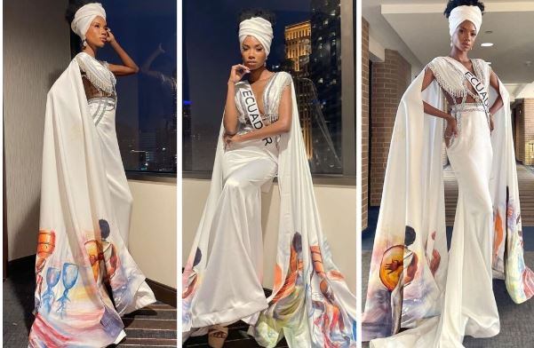 Este martes 10 de enero todas las participantes tuvieron su entrevista con el jurado y la representante de Miss Ecuador sorprendió a los medios al lucir un impactante vestido blanco que destacaba por tener una capa con imágenes alusivas a la cultura afroamericana.