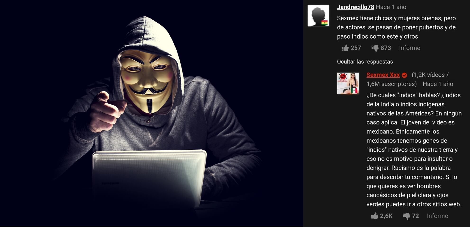 “¿De cuales “indios” hablas? ¿Indios de la India o indios indígenas? En ningún caso aplica. El joven del video es mexicano. Étnicamente los mexicanos tenemos genes de “indios” nativos de nuestra tierra y eso no es motivo para insultar o denigrar. Racismo es la palabra para describir tu comentario. Si lo que quieres es ver hombres caucásicos de piel clara y ojos verdes puedes ir a otros sitios web.”, fue la contundente respuesta de la productora de este material para adultos.