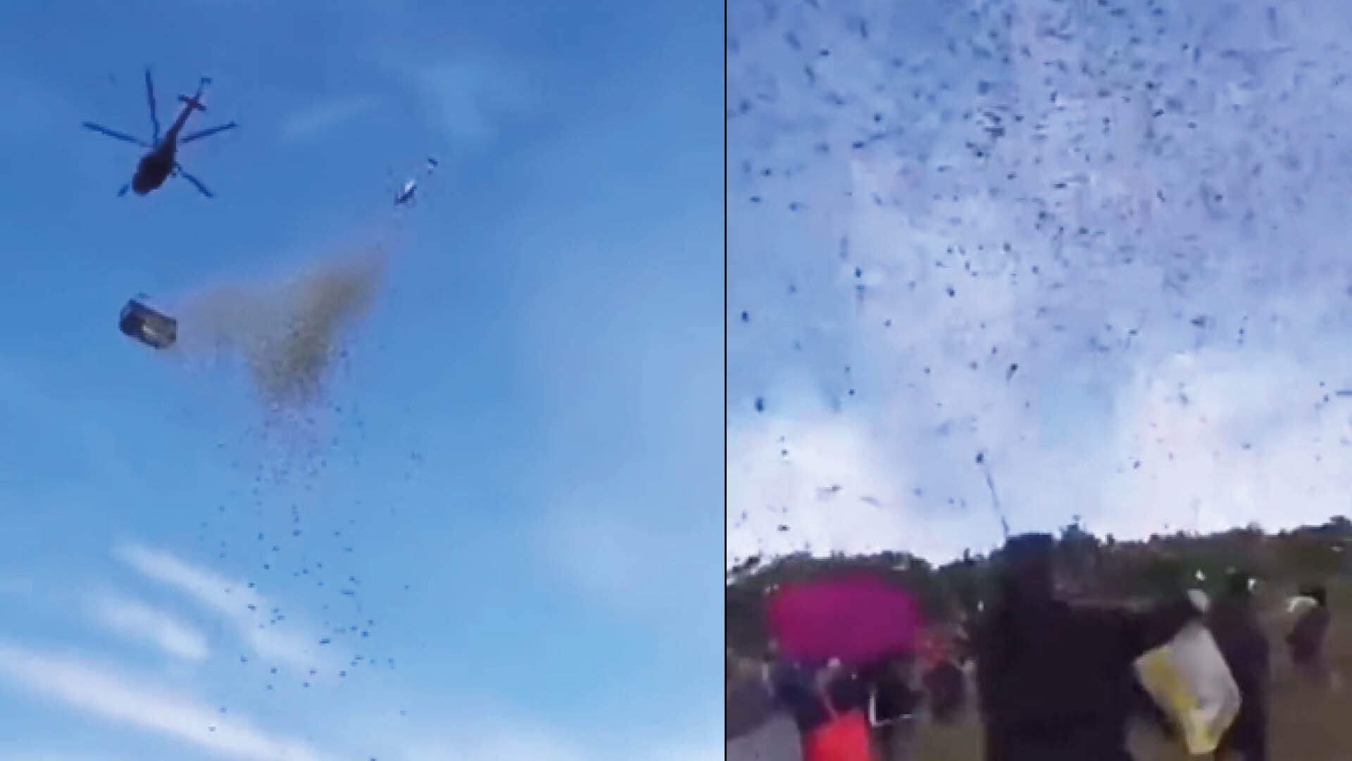 De acuerdo a los videos que se difundieron, el dinero estaba en un contenedor con una cerradura modificada. En la tierra estaban decenas de personas que corrieron detrás del dinero que literalmente caía del cielo.