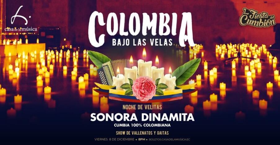 La Casa de la Música y la Fiesta del Cumbión presentan COLOMBIA BAJO LAS VELAS, una maravillosa noche de velitas junto a La Sonora Dinamita (Colombia) y sus mejores éxitos.