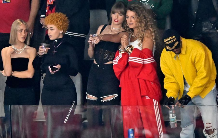 En compañía de Brittany Mahomes, Ice Spice y Blake Lively, Taylor fue vista en el show con un pantalón negro con pequeñas aberturas, un top tipo corset y detalles representativos de su novio, Travis Kelce. Aunque llegó al estadio con una chaqueta de los Kansas City, la cantante nunca se la puso debido al calor que hacía en Las Vegas.