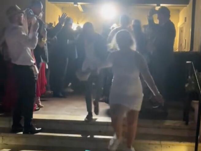 “Nuestras bengalas fueron canceladas porque estaba lloviznando. Estábamos saltando divirtiéndonos mucho y yo pensé, en ese momento, que teníamos que correr. Pensé que había agarrado la mano de mi esposo”, explicó la recién casada.