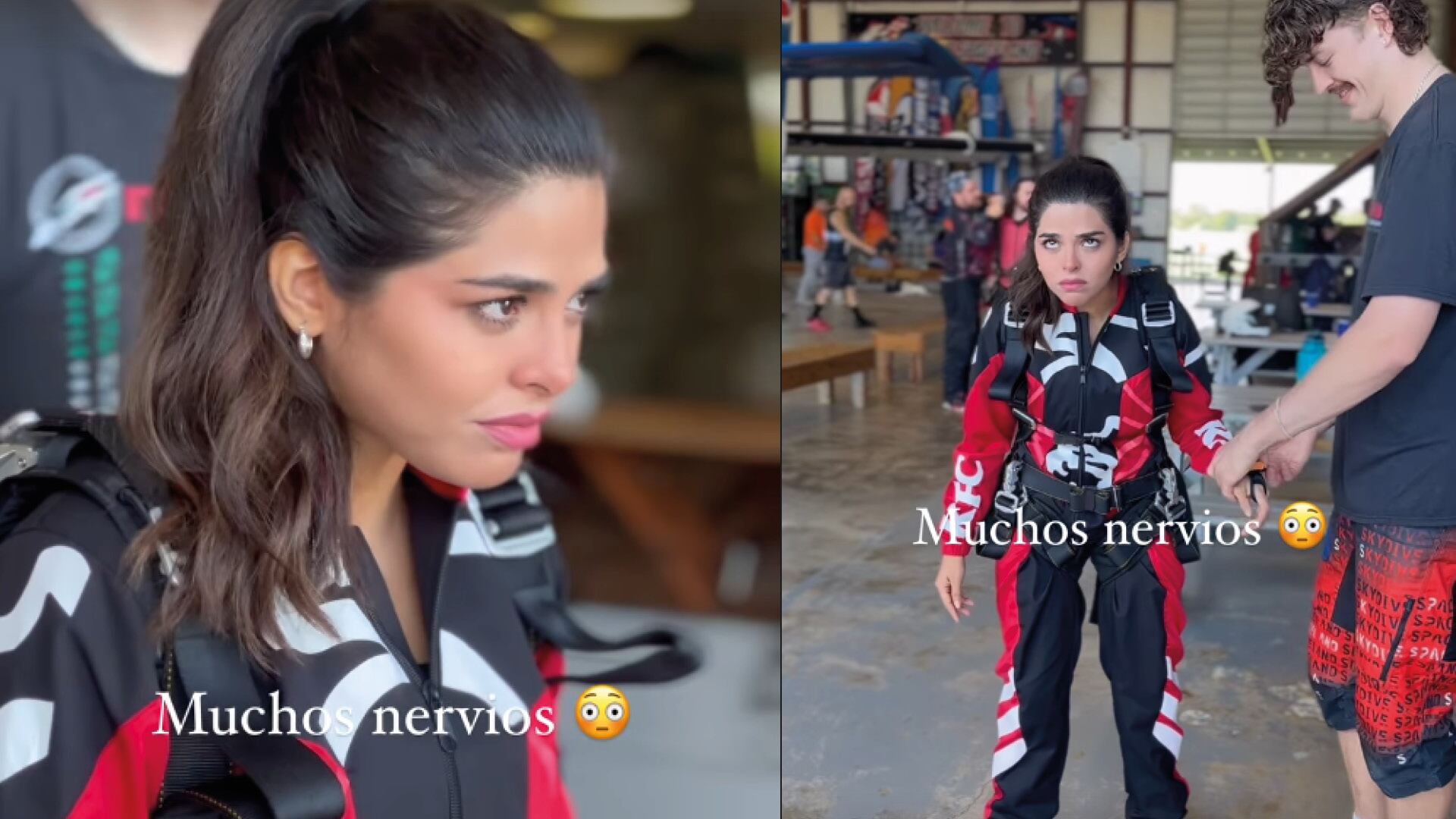 En sus redes sociales, la influencer contó que se sentía muy nerviosa ya que iba a practicar uno de los deportes más extremos. “Voy a saltar a cinco mil pies de altura y yo no se ni nadar, ni hacer bicicleta, pero bueno aquí estoy”, dijo mientras mostraba el avión.