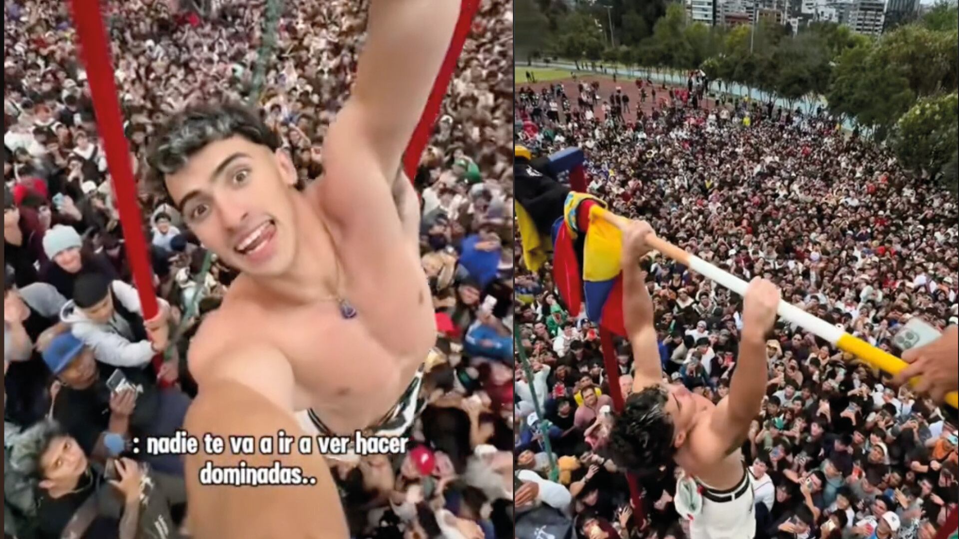 En videos compartidos en su cuenta de TikTok se puede ver a decenas de seguidores aglomerados apoyando al influencer que está colgado de las barras. “¡Cómo está mi gente de Ecuador!”, grita desde lo alto, mientras la multitud le responde con gritos y emoción.