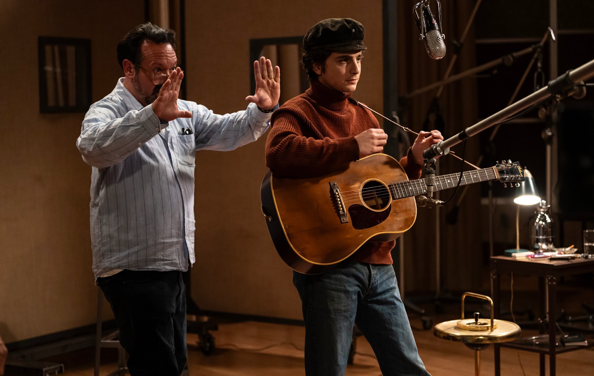 Para James Mangold, la experiencia de rodar la cinta ‘Walk the Line’ sobre Johnny Cash le ayudó a contar la historia de Dylan. “Me dio confianza a la hora de confiar en mis instintos. Sabía que quería llegar más lejos, correr más riesgos. Cuando sugerí esta película en conversaciones con los productores en el estudio y a la gente de Bob Dylan, les dije: No necesitaremos sus grabaciones. Vamos a hacer las nuestras. Y todos preguntaban: ¿Qué quieres decir? Y yo les dije: Bueno, no podemos permitir que Timmy hable con su propia voz y luego la voz de Bob salga de su boca, como un muñeco de ventrílocuo. Eso nunca va a funcionar. Mi confianza fue luego igualada por la ambición y disciplina de Timmy. Él llevó las cosas a otro nivel en el sentido de que establecimos todo esto como parte de nuestra preparación. Preparamos lo que será un álbum de banda sonora lleno de música en el estudio. No sólo Timmy está maravilloso en escena, sino que también ha demostrado su validez. Su método retorció la canción de Dylan de una forma que nunca hubiera podido hacer de otra manera. Hubo decisiones que tomó con la música como lo haría con el diálogo o la acción. Fue una lección muy poderosa para mí. Si no hubiera hecho una película como ‘Walk The Line’ antes podría haber dudado, pero tenía la sensación de que, como habíamos traspasado esos límites antes con actores tan buenos, sabía que si les das espacio para llenar, podrías tener suerte y llenarlo. Y eso es exactamente lo que sucedió con Timmy”, finalizó Mangold.