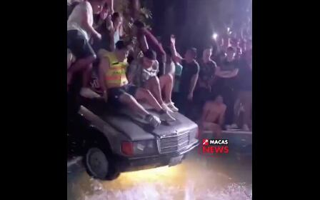 En imágenes difundidas por la cuenta ‘Balcón del Río Macas’ se observa como varias personas se suben al vehículo para enviarse al agua de una piscina. “El desmadre” es el título que lleva el acontecimiento.