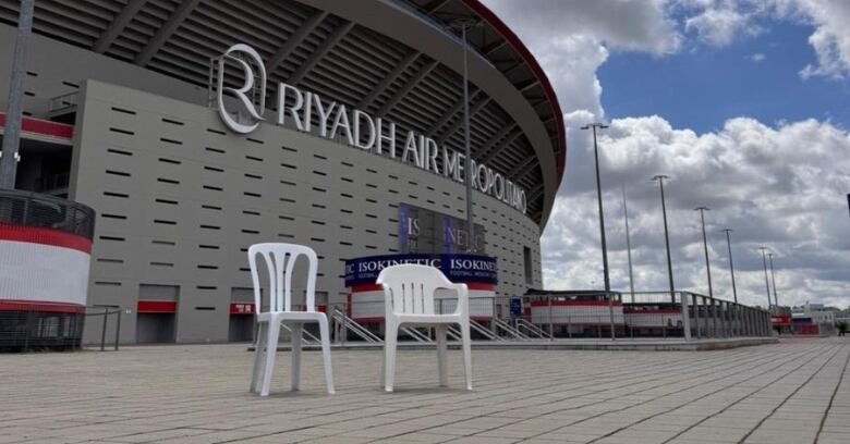 Las sillas de plástico blancas, similares a las que aparecen en la portada del álbum “Debí Tirar Más Fotos” de Bad Bunny, han sido colocadas frente a estadios en ciudades como Madrid, Barcelona, Ciudad de México, Buenos Aires, Santiago, Lima, San José, Bogotá y San Juan.