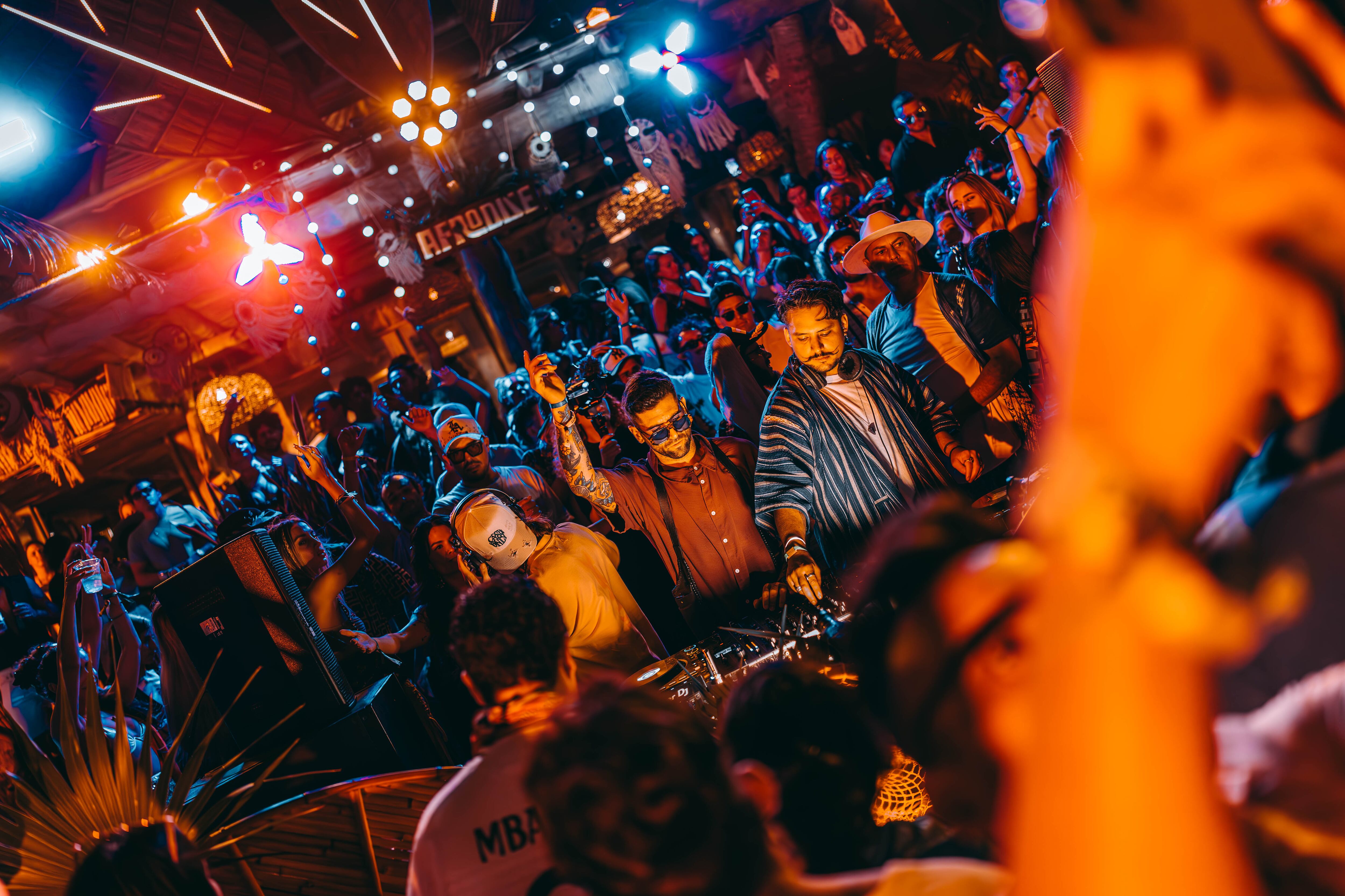 La decoración, inspirada en las fiestas de Tulum, convierte el espacio en un entorno selvático, elegante y tribal, que transporta al público a otra dimensión sensorial.