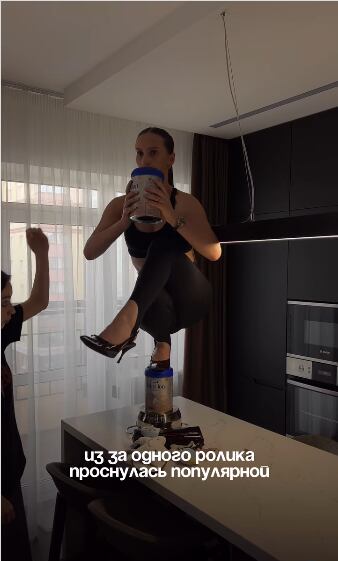 Mariana, usando tacones extremadamente altos, decidió subirse a un bote de leche para bebé colocado sobre la encimera, como parte de su versión personalizada del reto.