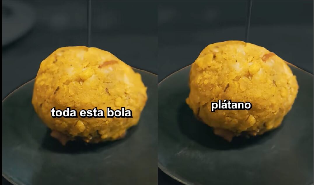 “Por parte de Ecuador tenemos el bolón de verde, que es básicamente masa de plátano verde con queso y chicharrón. Toda esta bola es el bolón de verde”, dice Ibai mientras muestra el plato.