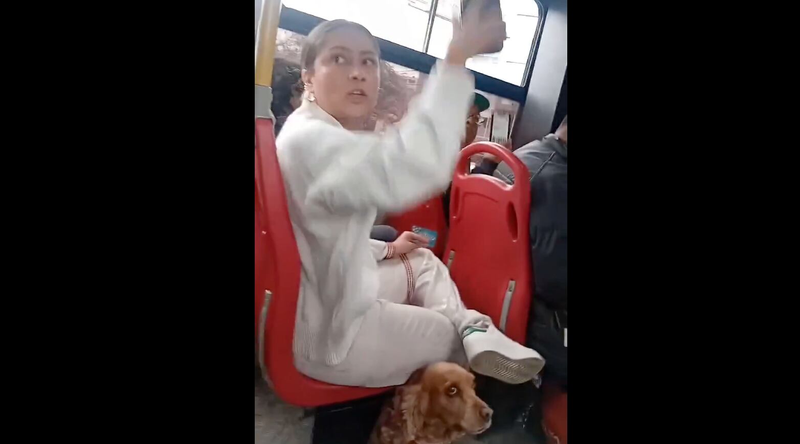 En el video, que se ha compartido ampliamente en plataformas como X, TikTok e Instagram, se ve a la mujer sentada junto a un perro de raza cocker spaniel, mientras varios pasajeros le recriminan que no puede subir con su mascota al bus.