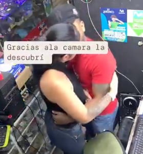 Un video captado por una cámara de vigilancia muestra el preciso instante en que una mujer, quien atendía un local de telefonía móvil, es grabada en una situación comprometedora con un supuesto cliente, mientras su esposo se encontraba a pocos metros de distancia.