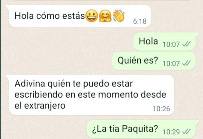 “Esta mañana, algo temprano para mi gusto, recibí un mensaje de un número desconocido. Alguien que me escribía desde el extranjero, al parecer. No tardé en caer: había de ser mi tía Paquita, que hace años marchó a Oxford a estudiar”, partió diciendo en el hilo tuitero, en donde compartió los pantallazos de la conversación por WhatsApp.