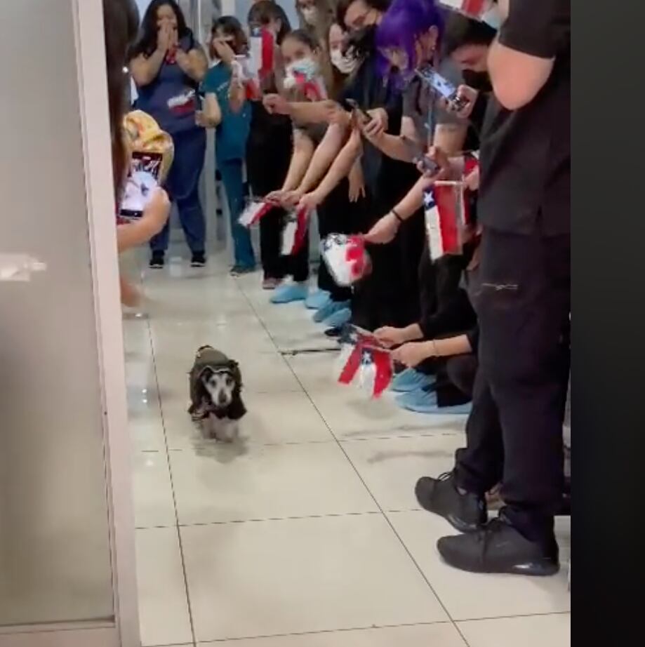 Y es que al igual que hacen los hospitales con los humanos, los veterinarios crearon un pasillo, todos moviendo banderitas chilenas, para que pasara el perrito, que caminó hasta sus dueños. Y con una pinta de huaso, ad hoc a la música que sonaba de fondo.