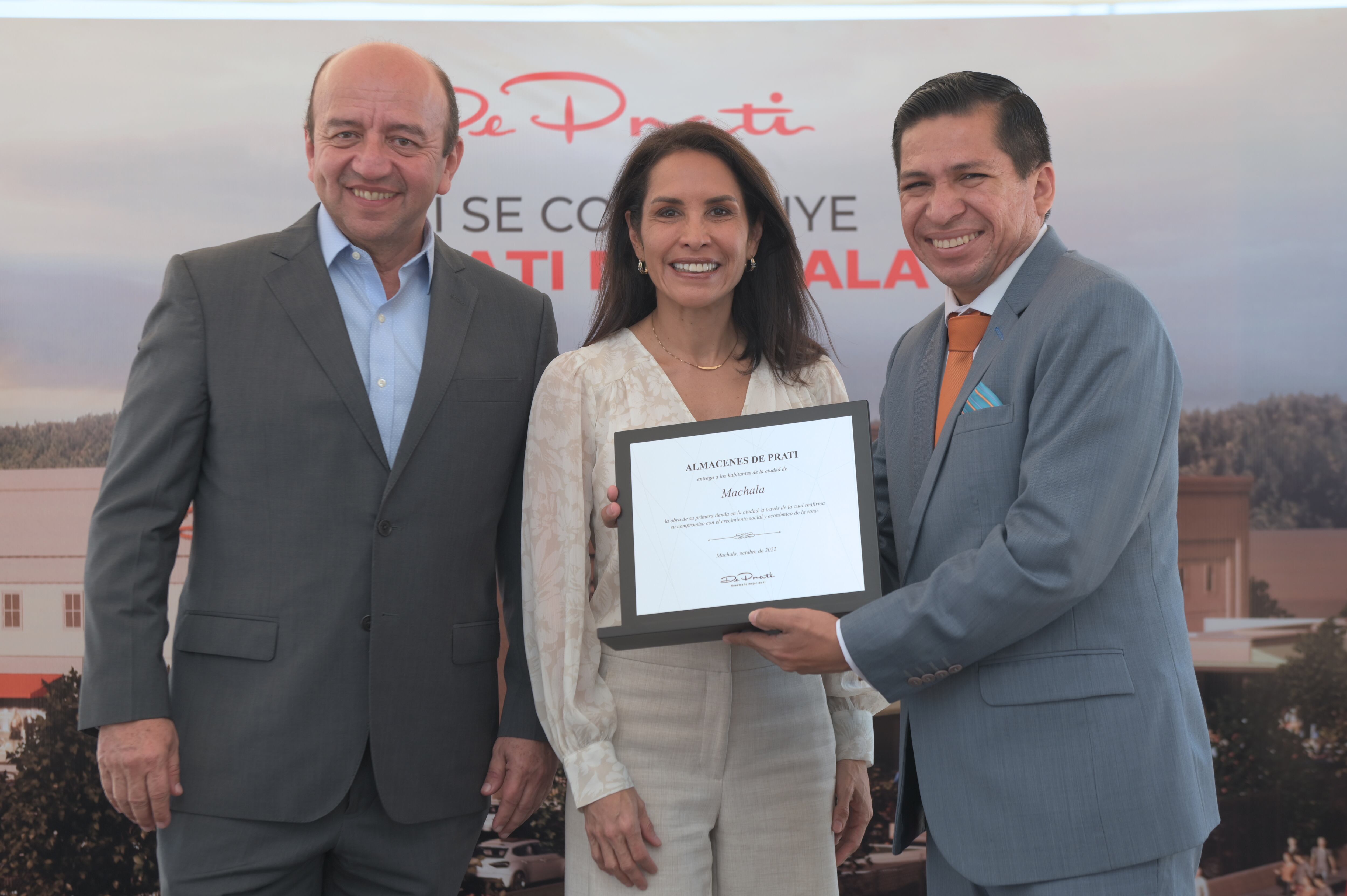 Priscilla Altamirano, Presidente de Almacenes De Prati, hizo la entrega de este proyecto a Darío Macas, Alcalde de Machala, como muestra de su compromiso con el desarrollo económico y social de la ciudad, en un evento al que además asistieron otras autoridades. Durante su intervención, se destacó detalles de la tienda, cuyo objetivo es esencialmente servir a los 700.000 habitantes de la provincia a través de una tienda moderna y con productos de la más alta calidad.