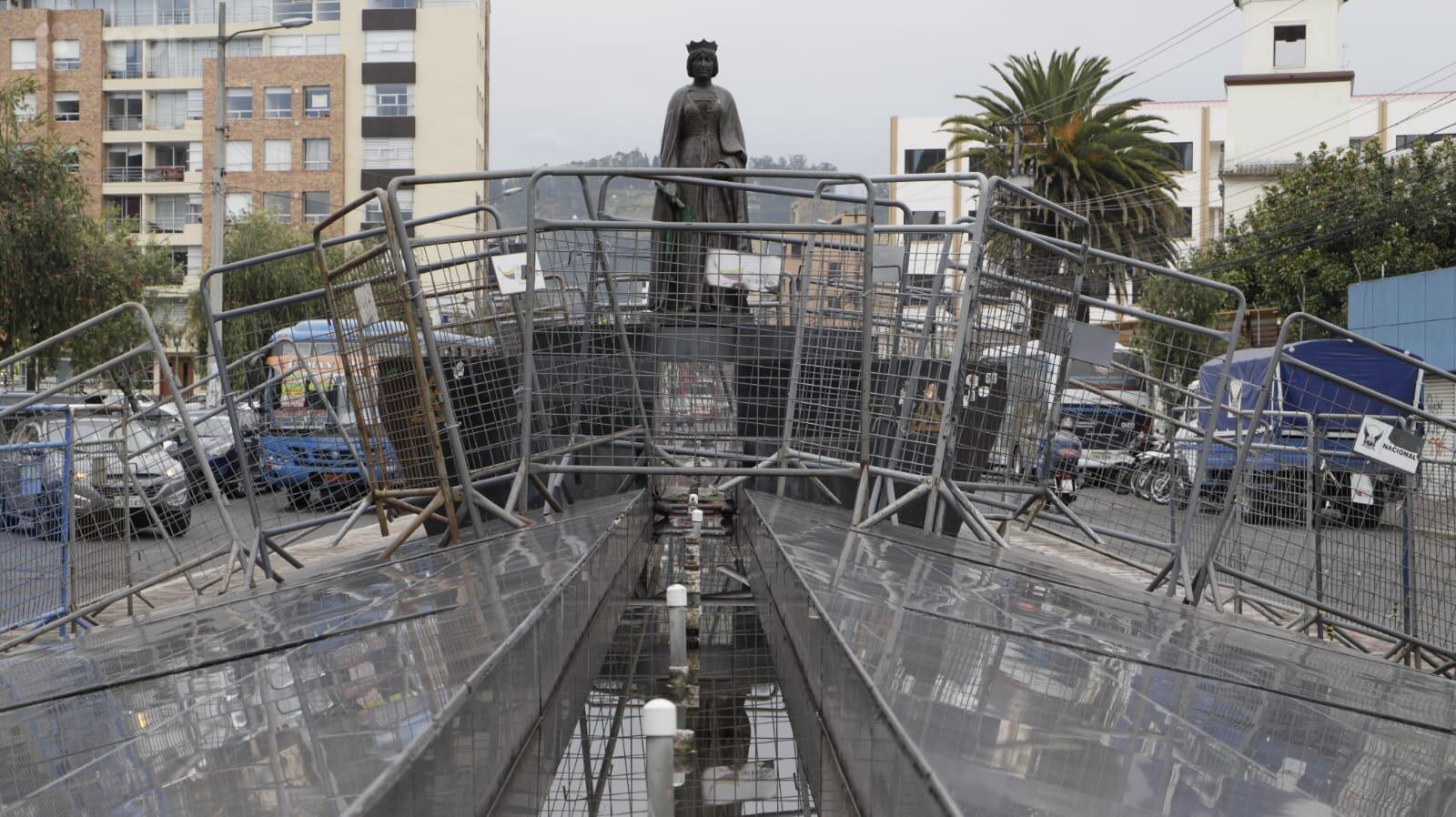Miembros de la Policía Nacional se desplegaron este martes en torno a la estatua de Isabel la Católica en Quito, que se encontraba rodeada por vallas metálicas, para impedir intentos de asalto al monumento como el ocurrido en año pasado.