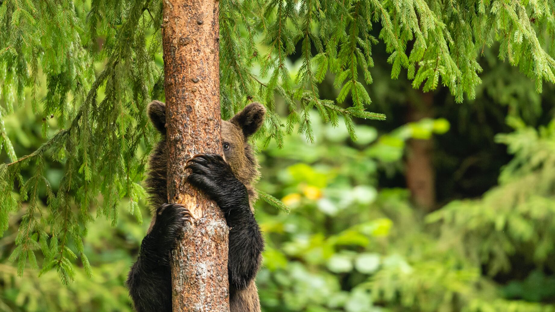 Este joven oso pardo -captado en un bosque rumano- bajando de un esbelto árbol parece estar jugando al escondite con otros osos. / Pal Marchhart, Hungría.
