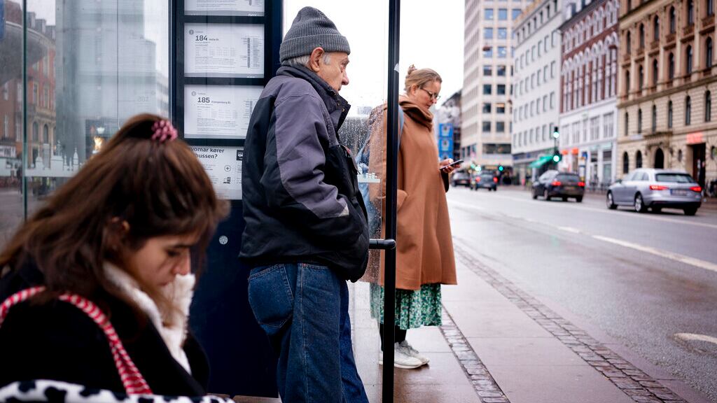 Un grupo de personas esperan la llegada de un autobús de pasajeros en una parada en Copenhague. Un grupo de personas esperan la llegada de un autobús de pasajeros en una parada en Copenhague, Dinamarca, el martes 1 de febrero de 2022. (Liselotte Sabroe/Ritzau Scanpix vía AP) (Liselotte Sabroe/AP)