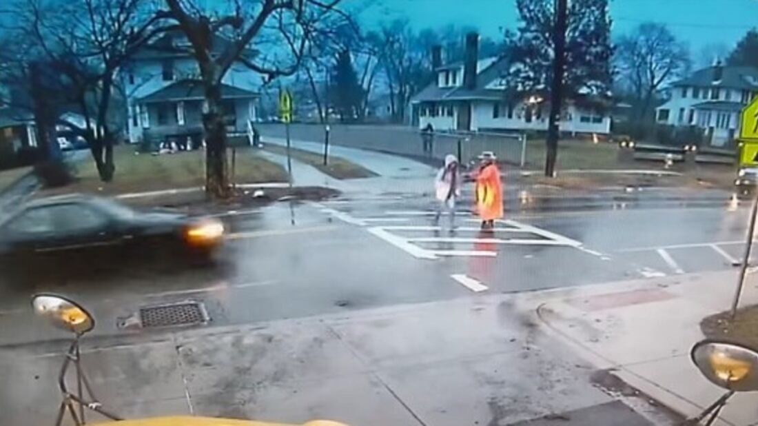 En el video se observa que en medio de la lluvia Goodyear está dirigiendo el tráfico en la vía y comienza a hacerle señas a la conductora de un vehículo que se detenga pues una joven estaba atravesando la calle en medio de la lluvia.