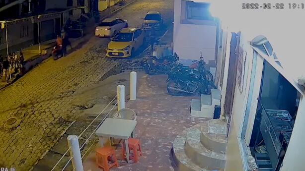 En el video se puede ver a un grupo de personas sentadas en unas gradas, de pronto una moto se empieza a acercar y cuando llega se baja un tipo con un arma.