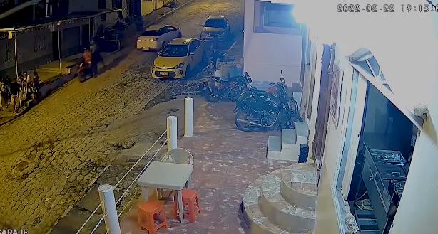 En el video se puede ver a un grupo de personas sentadas en unas gradas, de pronto una moto se empieza a acercar y cuando llega se baja un tipo con un arma.