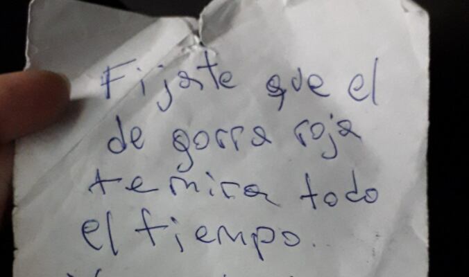 En la imagen se ve un mensaje escrito a mano, en donde la mujer le advierte que un hombre la venía observando.