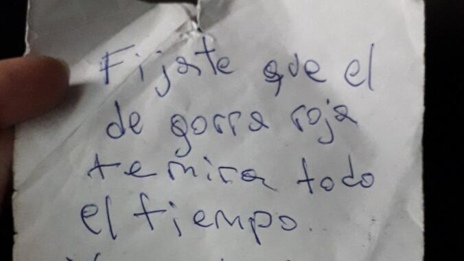 “Fíjate que el de gorra roja te mira todo el tiempo. Yo me bajo en Trenque. Entre nosotras nos cuidamos”, señalaba el escrito.