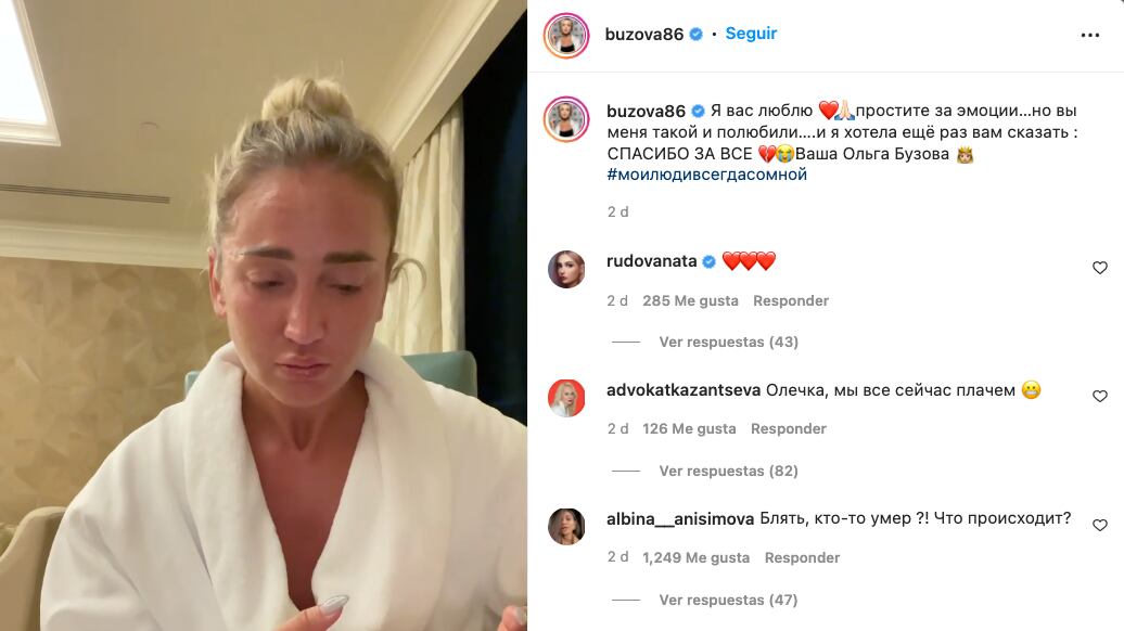 “No tengo miedo de admitir que no quiero perderlos (haciendo referencia a sus seguidores). Solo compartí mi vida, mi trabajo y mi alma. No hice todo esto como un trabajo para mí, esto es parte de mi alma. Se siente como una gran parte de mi corazón y me están quitando la vida. Lejos de mí”, afirmó Buzova donde también dijo que no sabe que pasará en su futuro y cómo obtendrá ahora sus ingresos.