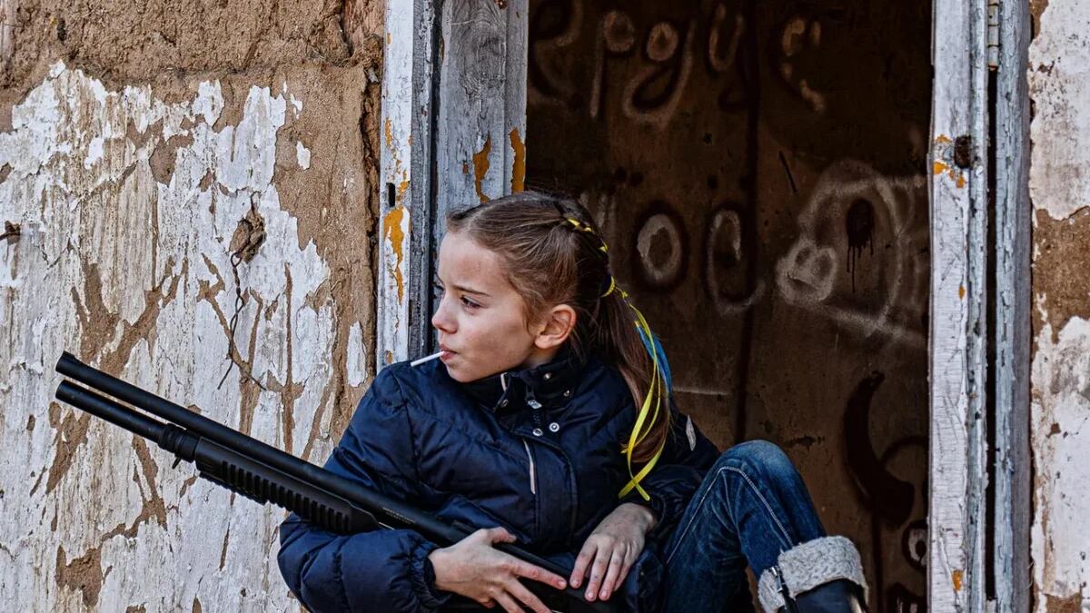 Son unas fotografías que se han hecho virales en las últimas horas en las redes sociales a nivel mundial. La nena observa con una mirada vigilante desde las ruinas de una casa en Ucrania. Entre sus inocentes brazos carga un rifle. Con 9 años ya desafía al Imperialismo Ruso. Tiene una paleta en la boca y su cabello esta sujetado por unas cintas que llevan los colores de la bandera de su nación.