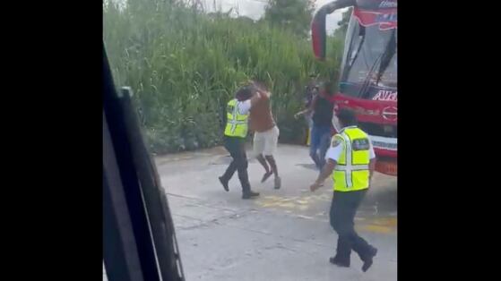 Al inicio de la grabación se ve como los uniformados siguen al hombre – al parece el enfrentamiento nació durante un proceso de revisión de documentos en la vía- que comienza a intercambiar golpes con uno de los agentes.