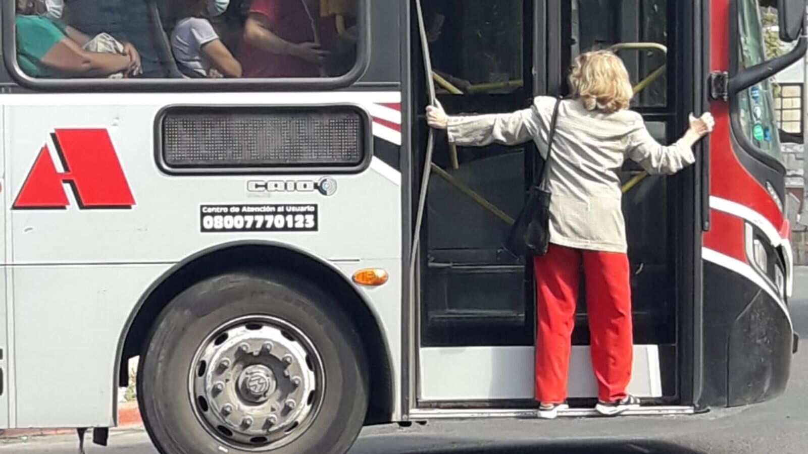 En Córdoba, Argentina, se ha viralizado una imagen donde se ve a una mujer que viaja literalmente colgada a la puerta de un bus del transporte público.