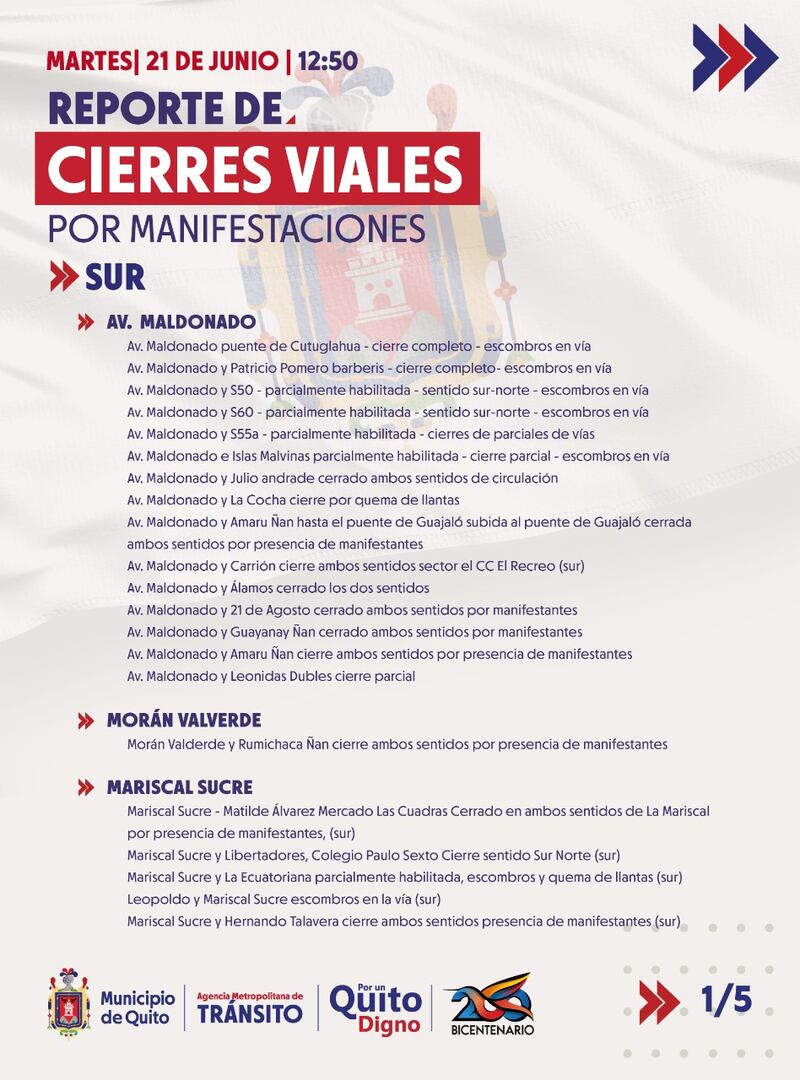 - Al momento en el sector de Llano Chico sobre el Redondel de Gualo en la av. Simón Bolívar y 17 de Septiembre, cierre de ambos carriles, sentidos oriente - occidente y occidente - oriente.