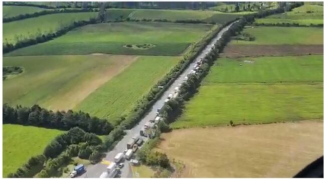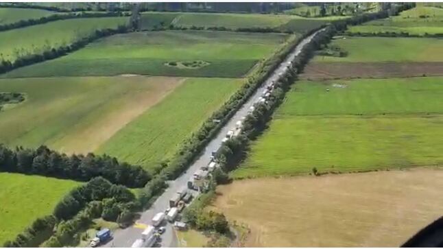 Se puede observar una gran cantidad de vehículos de carga pesada que están varados en la vía debido a los bloqueos por los manifestantes en el día de 17 de paro nacional.