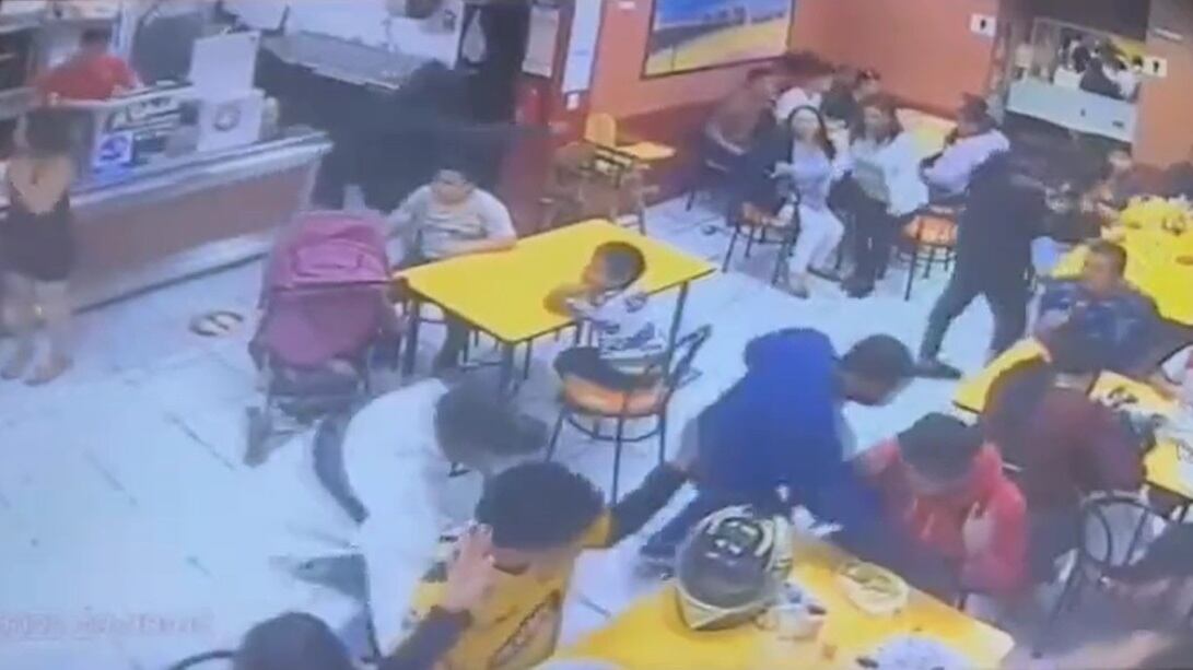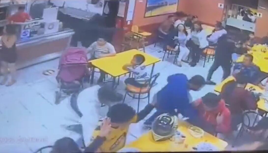 En una de las meses también estaban sentados dos niños y un bebé en un coche y se puede ver en el video que uno de los ladrones pasa a centímetros de los menores con un arma de fuego.