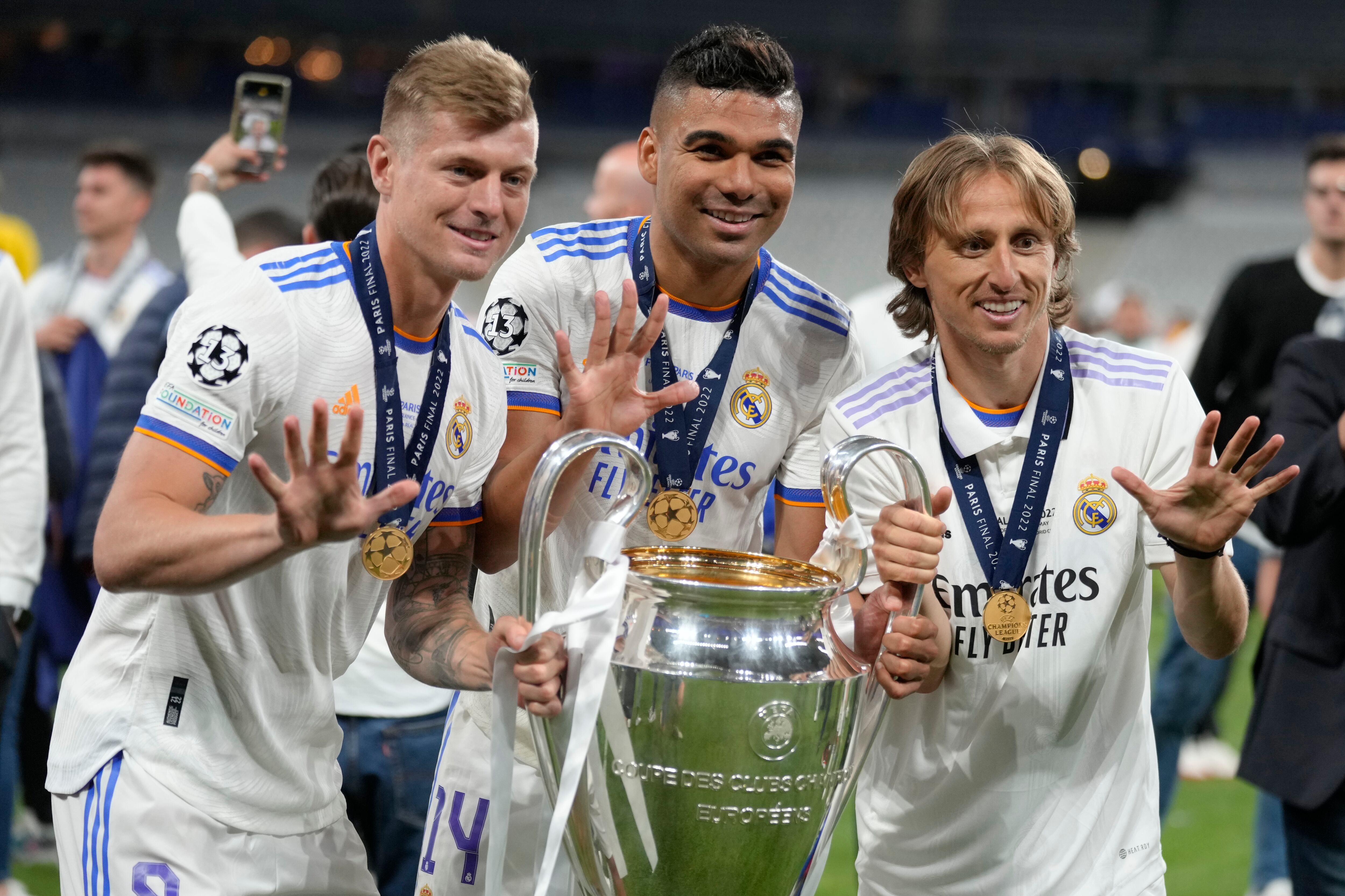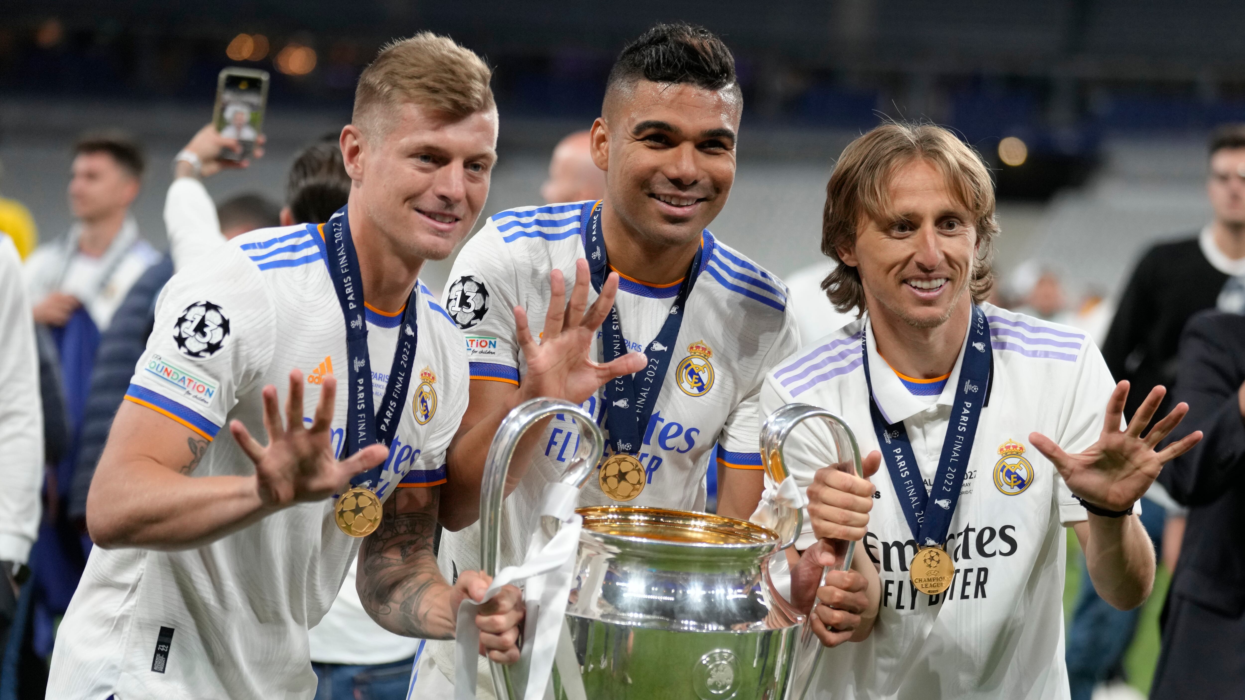 El alemán Toni Kroos, el croata Luka Modrić y el austriaco David Alaba aparecen con sus camisetas conmemorativas y con las medallas puestas. El toque de distinción lo dio el defensa central Alaba quien luce una corbata por sobre la camiseta. De fondo, la épica “Mi Bebito Fiu Fiu”.