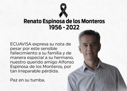 “Desde Ecuavisa enviamos un abrazo solidario a nuestro compañero y amigo @alfonsoespinosadelosmonteros, por la pérdida de su hermano, Renato”, reseña el pie de foto compartido por el mencionado medio.