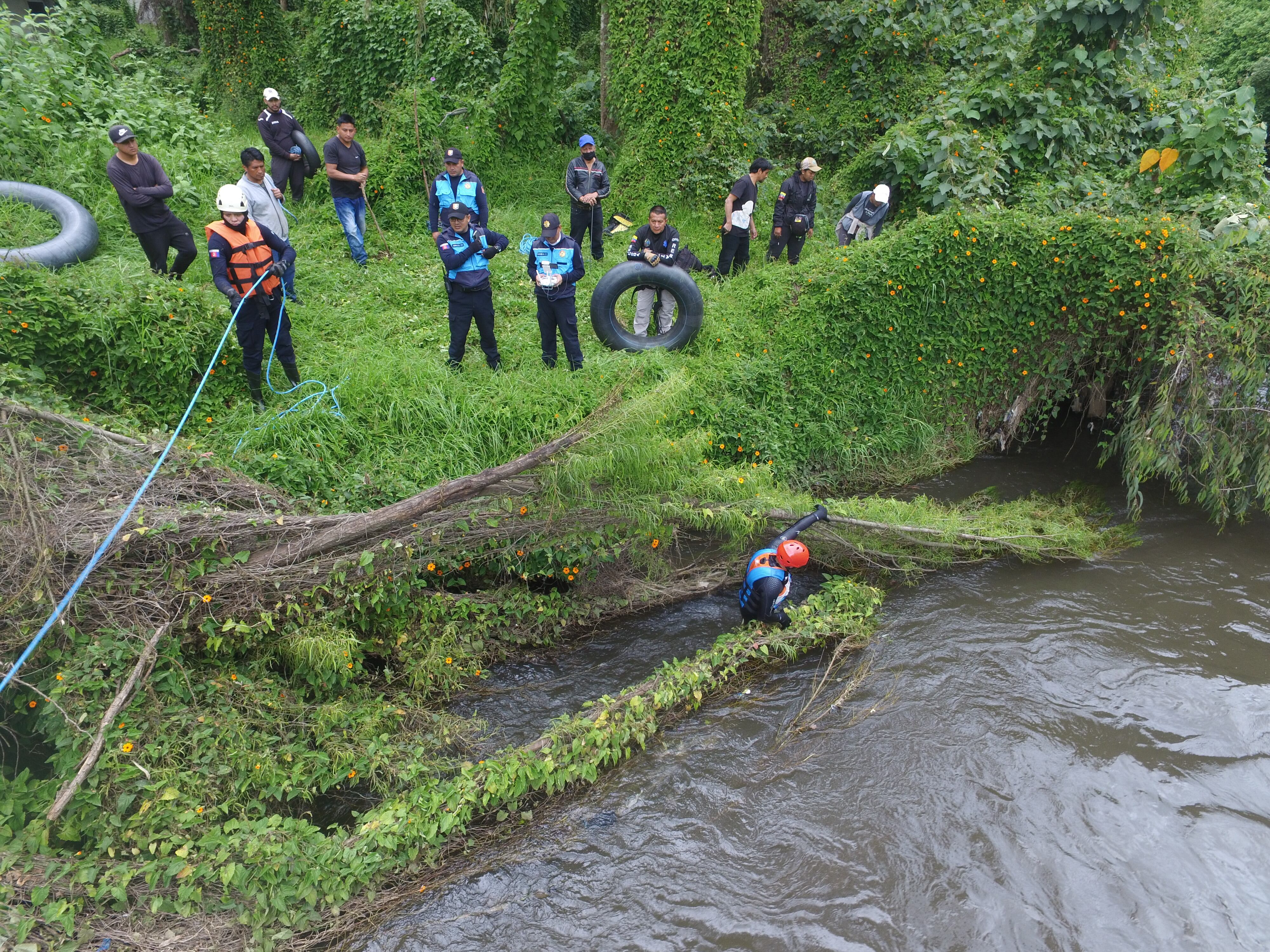 En la siguiente fase, integrante del GOE, Bomberos de Rumiñahui y CACMQ realizaron un recorrido por el río con el equipo de salvamento acuático hasta la bocatoma ubicada en el sector de la Armenia.