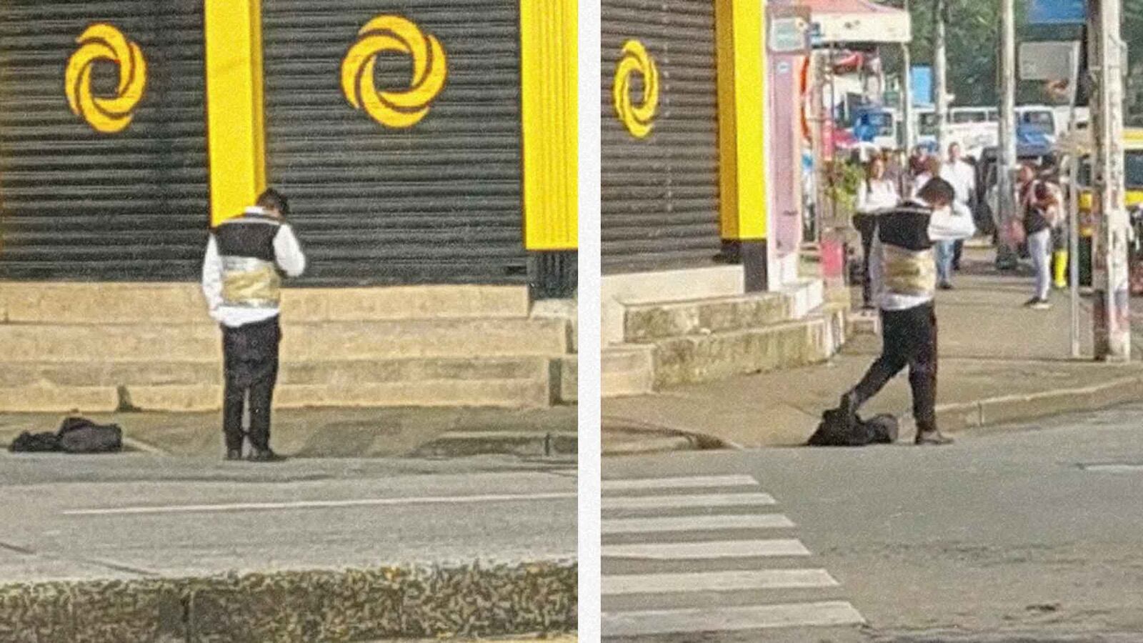 En las imágenes difundidas en redes sociales, se puede ver como un hombre vestido con un pantalón oscuro y camisa se encuentra parado en los exteriores de un establecimiento dedicado a la venta y compra de joyas.