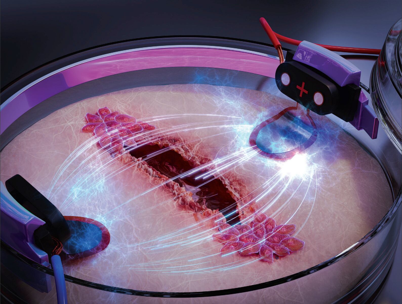 - Las heridas cicatrizan por los bordes, lo que significa que las células cutáneas tienen que abandonar el borde e invadir la zona de la herida. Las células de la piel (y muchas otras células también) tienen la capacidad de alinear sus movimientos con un campo eléctrico. Esto significa que el campo obligará a las células a moverse siempre en la misma dirección, asumiendo en cierto modo el control del sistema de navegación celular. Esto ya ocurre en biología, pues los campos eléctricos se producen de forma natural. Lo que hemos demostrado es que si a eso le añadimos la estimulación, podemos aumentar este efecto e impulsar activamente sus movimientos directos hacia el centro de la herida.