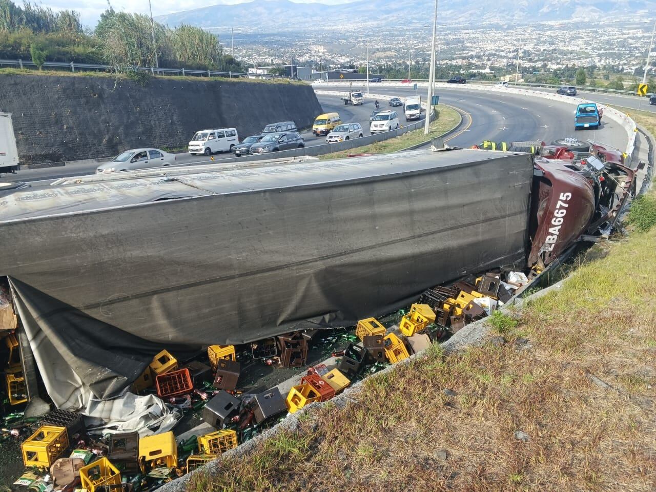 La tarde de este martes 08 de agosto ocurrió un accidente de tránsito que involucró a un tráiler que transportaba botellas de bebidas alcohólicas. Cerca de las 15:45 el transporte pesado se volcó en un tramo del trayecto que une Quito con el Aeropuerto ubicado en Tababela.