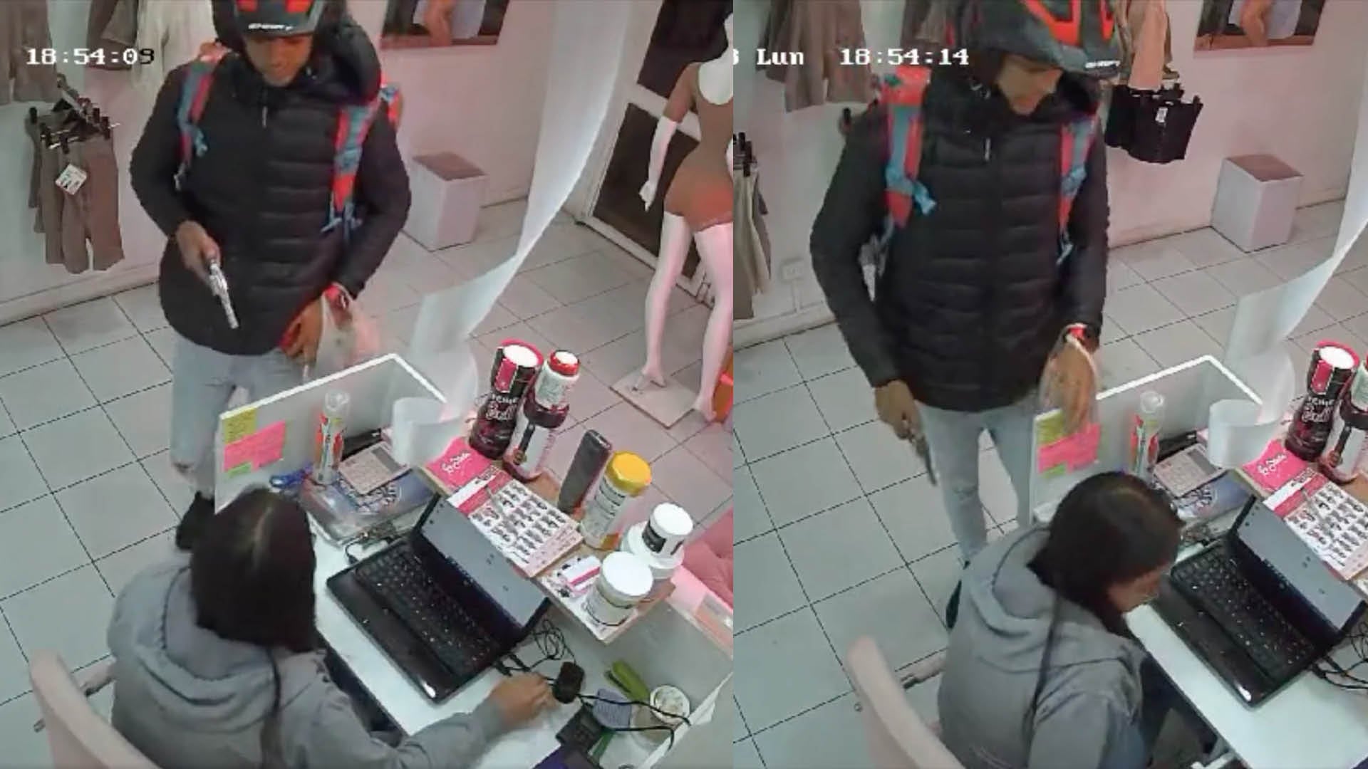 Luego de fingir por varios minutos que era un cliente, el hombre saca su arma de fuego y le dice a la chica apuntándola “¡Siéntate allá! y le pide a la otra víctima que le entregue los celulares y todo lo que tiene en el cajón del escritorio. Además, le exige el dinero y ella le menciona que no tienen nada de efectivo.