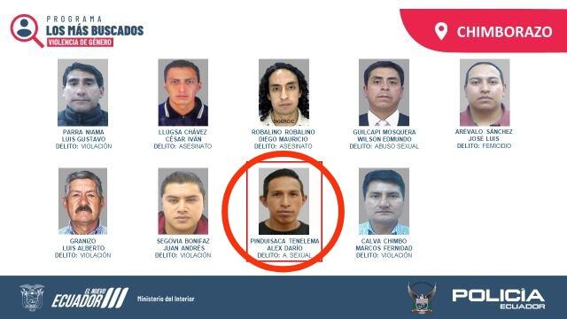 Mediante técnicas y diligencias investigativas, servidores policiales lograron identificar al ciudadano Alex Darío P. T., quien es requerido por la justicia ecuatoriana, considerado como el octavo más buscado de la provincia de Chimborazo, procesado por el delito de abuso sexual.