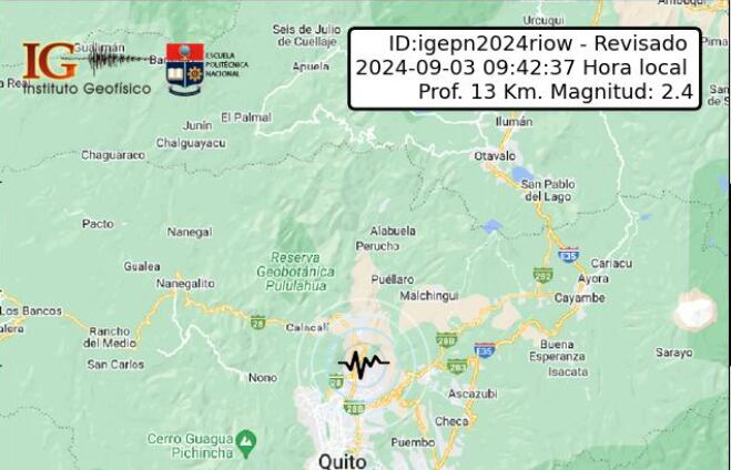 El Instituto Geofísico de la Escuela Politécnica Nacional (IGEPN) informó que se registró un sismo de 2.4 a 14.94 km de Quito, la mañana de este martes 3 de septiembre de 2024.