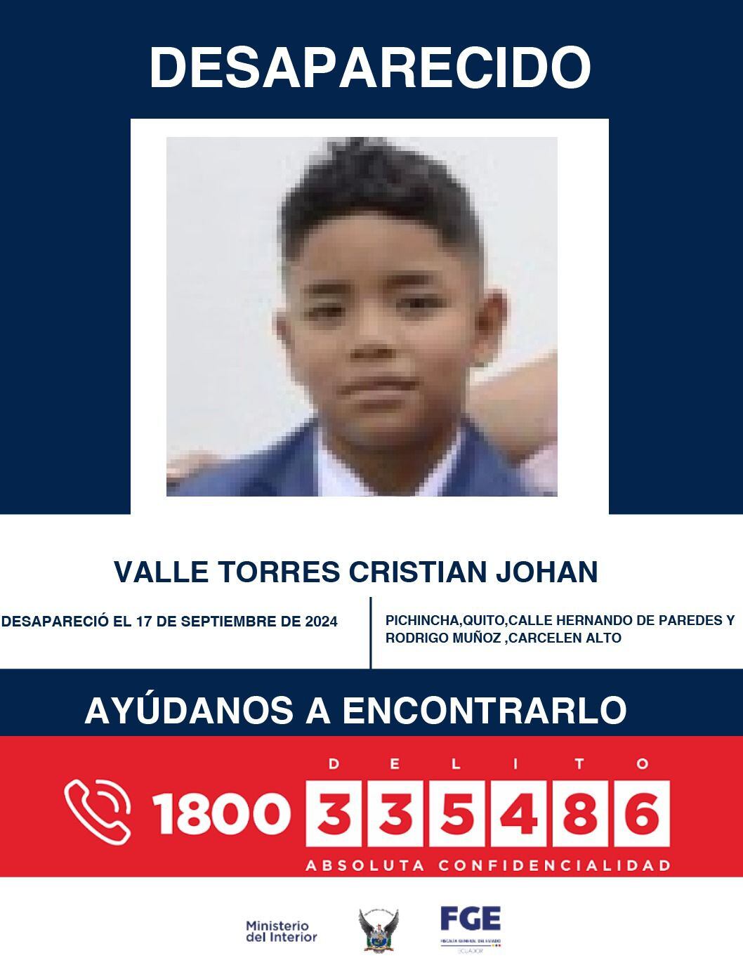 Se reporta la desaparición de un menor de siete años. El joven Cristian Johan Valle Torres fue visto por última vez en Carcelén Alto, en el norte de Quito.