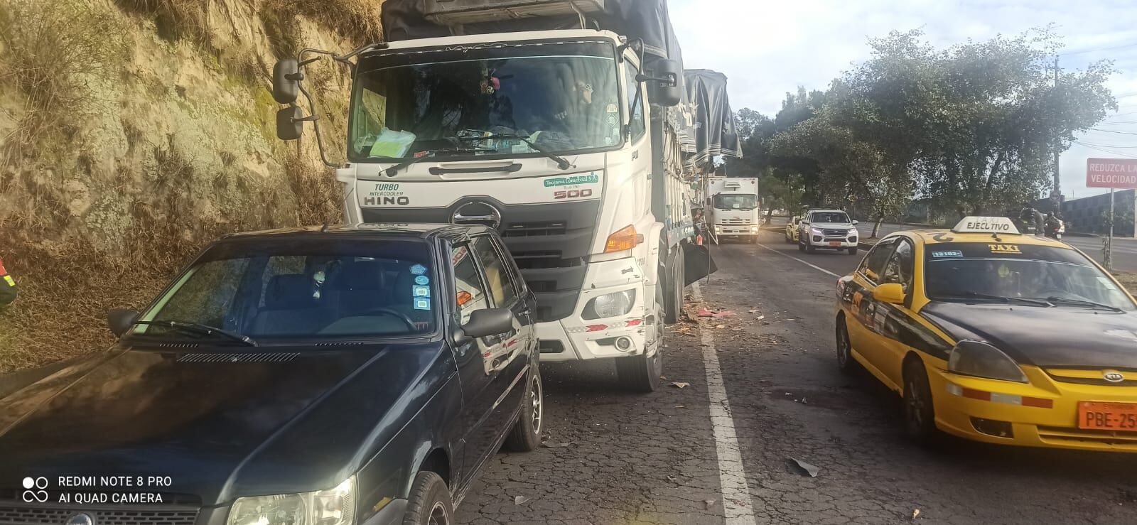 Luego está otro vehículo de color blanco, mismo que está pegado la parte trasera del automotor con la parte delantera de la buseta. Finalmente se observa en el clip que un camión están involucrado en el siniestro y la parte de atrás del mismo también sufrió daños.