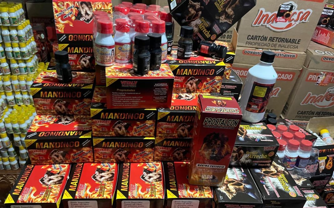 Entre las sustancias incautadas figuran sildenafil, colorantes y testosterona, así como etiquetas que llevaban la leyenda “Hecho en EE.UU.”, listas para ser adheridas a los envases almacenados.