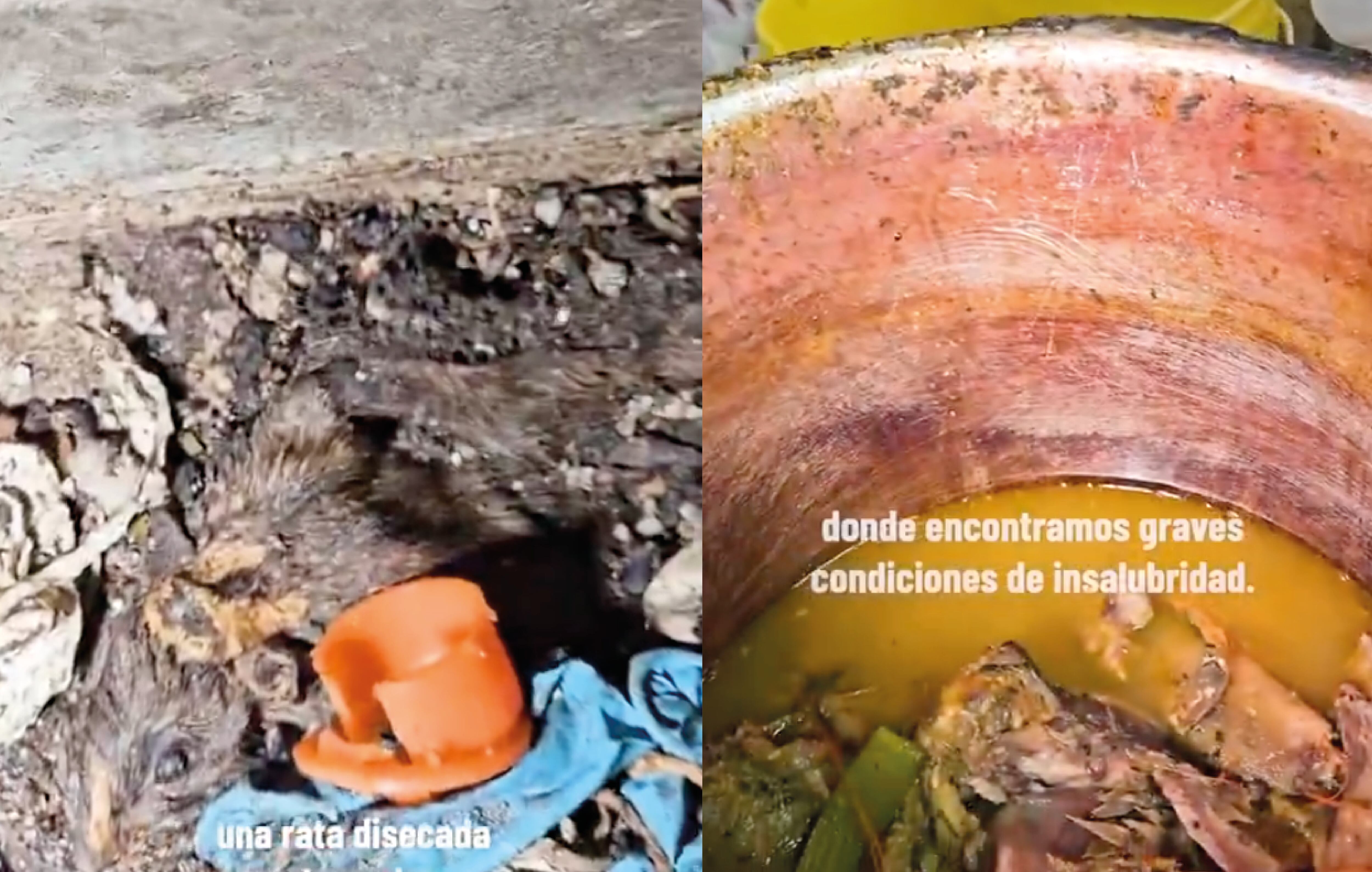 En las imágenes se puede evidenciar las graves condiciones de insalubridad como ollas negras y con restos de comidas anteriores, los pisos y paredes llenos de suciedad, comida mal almacenada, plagas y la rata