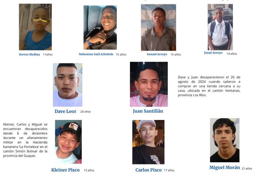 La Asociación de Familiares y Amigos de Personas Desaparecidas en Ecuador (Asfadec) expresó su profunda preocupación y exige al Estado ecuatoriano respuestas inmediatas, concretas y transparentes sobre el paradero de los nueve adolescentes y jóvenes desaparecidos en circunstancias similares: