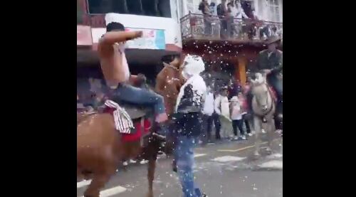 En un video publicado este lunes 03 de marzo se observar como el sujeto intentó bajar al jinete de su montura. Al recibir el golpe del caballista, este se sujeta a su montura y es arrastrado algunos metros.